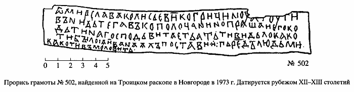 Начало работ на Троицком раскопе в 1973 г. ознаменовалось находкой восьми берестяных грамот. Семь из них (№ 502-508) обнаружены в слоях рубежа ХП-ХШ столетий. С грамоты № 502 началось наше долгое знакомство с двумя выдающимися людьми средневекового Новгорода. Воспроизведем ее текст: