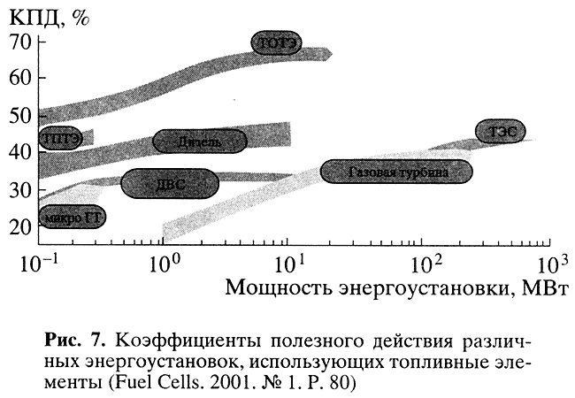 Топливный элемент - лишь составная часть электрохимического генератора, который содержит еще системы кондиционирования, подготовки топлива, утилизации отходов и др. (рис. 6). Первичным топливом могут быть метан, пары метанола, керосина, синтез-газ и т.д. Коэффициенты полезного действия у генераторов с топливными элементами (рис. 7) изменяются от 30% (двигатели внутреннего сгорания и газовые турбины) до 60-65% (энергоустановки с твердооксидными топливными элементами).