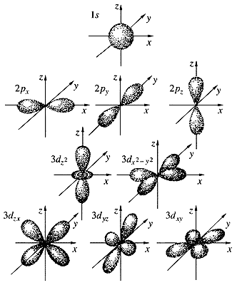 Рис. 1. Схема водородных (базовых) атомных орбиталей s, p и d Результаты таких экспериментов восхитительны: оказалось, что форма рассеивающего потенциала точно воспроизводит форму атомной орбитали, выведенной из уравнения Шредингера. Можно, конечно, брюзгливо сказать, что это банально. Но надо помнить, что волновые функции (атомные орбитали) получены на кончике пера и на острие мысли - из уравнения Шредингера с кулоновским потенциалом. И отсюда следуют сразу два фундаментальных вывода.