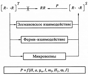 Рис. 3. Схема спиновой химии: магнитные взаимодействия (зеемановское, ферми и микроволны) переключают реакцию двух радикалов R из триплетного, запрещенного для реакции канала, в синглетный канал; вероятность реакции Р есть функция всех магнитных параметровМагнитные взаимодействия (зеемановские, ферми, то есть электрон-ядерное, и микроволновое) изменяют спин пары, превращая триплетное состояние в реакционноспо-собное, из которого рождаются продукты. По этой причине вероятность реакции Р в радикальной паре есть функция всех параметров, характеризующих магнитные взаимодействия:
