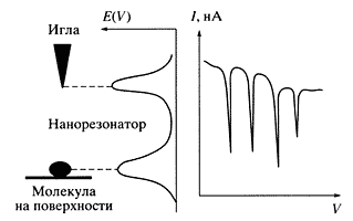 Рис. 4. Туннельная спектроскопия одиночной молекулы: слева - схема расположения иглы туннельного микроскопа и единичной молекулы на поверхности; справа - схема туннельного тока на электронно-колебательных переходах одиночной молекулыДвижение электронов в этой полости ограничено двумя квантовыми барьерами - на игле и на молекуле. Время пребывания электронов в полости - 10-12-10-11 с, так что полость "работает" как наномасштабный резонатор, характеристическая частота которого есть функция потенциала на игле. Когда эта частота совпадает с собственной частотой электронно-колебательного перехода в молекуле, нижний барьер становится прозрачным и туннелирующие электроны легко просачиваются через него. Туннельный ток как функция потенциала иглы есть электронно-колебательный "портрет", спектр индивидуальной, одиночной молекулы [5].
