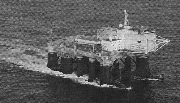 Основной элемент комплекса - стартовая платформа, построенная на базе морской самоходной полупогружаемой нефтебуровой платформы (рис. 3). Ее оборудование обеспечивает хранение ракеты"Зенит-SSL" в ангаре во время перехода в район старта, подачу и установку ракеты на пусковой стол, заправку ее компонентами топлива и сжатыми газами, предстартовую подготовку и пуск.