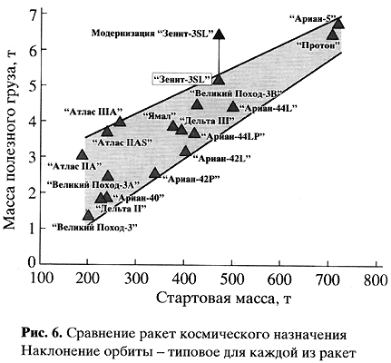 28 марта 1999 г. осуществлен демонстрационный запуск космического объекта "Демосат" на рабочую орбиту. Запуск и выведение космического аппарата (КА) прошли без каких-либо серьезных замечаний, с высочайшей точностью, что ознаменовало введение этого уникального комплекса в эксплуатацию. 10 октября 1999 г. состоялся первый коммерческий запуск КА "Direc TV" с исключительной точностью выведения на рабочую орбиту. После устранения имеющихся, на наш взгляд, конструкторских "излишеств" и технически неоправданных решений ракета-носитель"Зенит-SSL" должна превзойти остальные конкурирующие ракеты (рис. 6). Ее энергетические характеристики могут быть улучшены, обеспечив выведение на отлетные траектории полезного груза массой до 6300 кг, что приблизит ее к разрабатываемой сегодня самой мощной ракете-носителю "Ариан-5" (6800 кг).