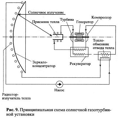 13.3Первое - сооружение солнечной газотурбинной установки (СГТУ) для Международной космической станции (рис. 9) совместно с Исследовательским центром им. М.В. Келдыша. КПД установки может достигать 30% и выше, однако большая масса позволяет использовать ее только в составе крупномасштабных комплексов (масса которых более 400 т).