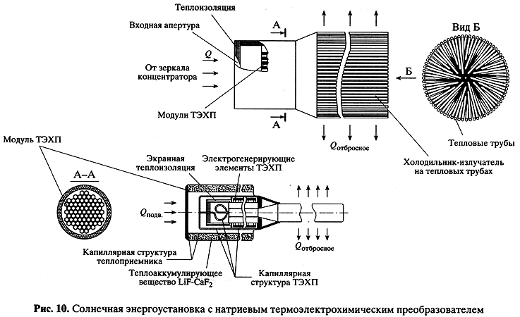 Среднесуточная мощность, кВт 10 Выходное напряжение, В 120 Диаметр зеркала, м 9,5 Теплоаккумулирующее вещество 80%LiF + 20%CaF2 Рабочее тело газотурбинного преобразователя 32%He + 68Xe Температура газа, °С на входе в солнечный приемник-аккумулятор 538 на выходе из солнечного приемника-аккумулятора 750 КПД солнечного приемника-аккумулятора, % >85 КПД преобразования тепловой энергии в электрическую 30 Масса, т 5,5 Второе направление - вариант солнечной энергоустановки мощностью 10 кВт на основе термоэлектрохимических преобразователей (ТЭХП). Над ним "Энергия" работает в сотрудничестве с Государственным научным центром Российской Федерации "Физико-энергетический институт" (ГНЦ РФ "ФЭИ"), возглавляемым академиком В.И. Субботиным. Здесь в основу положен принцип использования электрохимического потенциала натрия при разных температурах (рис. 10).