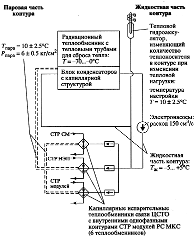 Другой важнейшей совместной работой "Энергии" и Исследовательского центра им. М.В. Келдыша является отработка принципиально новой системы терморегулирования для Международной космической станции на базе использования двухфазного контура (ДФК) циркуляционной системы терморегулирования (СТР), рабочим телом которого является аммиак. Использование скрытой теплоты испарения аммиака в ДФК существенно увеличивает возможности теплопереноса и снижает расход теплоносителя. ДФК обладает значительными преимуществами в энергопотреблении, массе, габаритах по сравнению с традиционными (классическими) однофазными контурами. Данный принцип заложен в систему централизованного теплоотвода российского сегмента Международной космической станции (рис. 12). Энергопотребление СТР российского участка на базе ДФК (по сравнению с однофазным контуром) при максимальной мощности 30 кВт на порядок меньше, причем ее масса меньше почти вдвое (табл. 5).