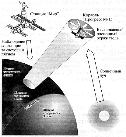 Несмотря на то, что сегодня в средствах массовой информации дается неоднозначная оценка этим работам, ведущимся на орбитальном комплексе "Мир", орбитальные солнечные отражатели имеют большое будущее. Идея использовать плоские космические отражатели для передачи энергии Солнца на Землю была высказана еще в 20-х годах Ф.Э.Цандером. Их можно эффективно использовать для освещения отдельных участков Земли, если площадь отражателя составляет 5000-10000 м2. Главные проблемы здесь - минимизация масс и обеспечение автоматического их развертывания из транспортного положения. Понятно, что до недавнего времени эта задача относилась к разряду фантастических.