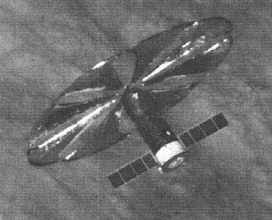При современном состоянии техники такие зеркала можно делать из полимерной металлизированной пленки, они развертываются в рабочее положение и поддерживают необходимую форму с помощью центробежных сил, возникающих при вращении отражателя вокруг оси, перпендикулярной его плоскости. В начале 90-х годов РКК "Энергия" приступила к практической реализации этой идеи, а в феврале 1993 г. был проведен демонстрационный эксперимент "Знамя-2": после рас-стыковки грузового космического корабля "Прогресс М-15" и станции "Мир" на корабле развернули 20-метровый тонкопленочный отражатель, с помощью которого осуществлялась подсветка Земли перед восходом Солнца (рис. 14). Формообразование бескаркасного пленочного отражателя, как уже сказано, проводилось за счет центробежных сил, возникавших при вращении барабана и принудительного сматывания секторов отражателя с катушек с помощью электромеханических приводов.