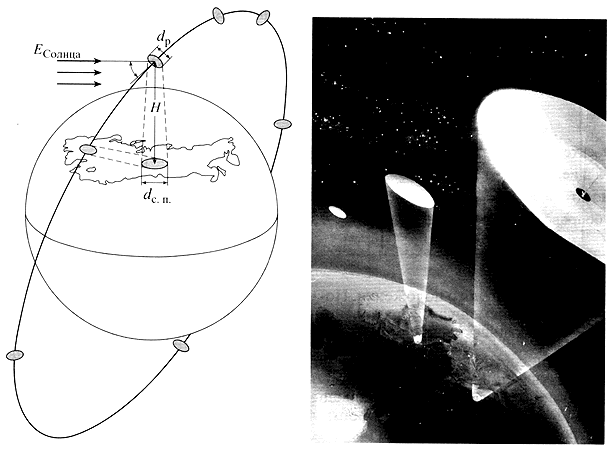 Что может дать реализация штатной системы искусственного освещения из космоса? Система должна состоять из группы космических рефлекторов (диаметром несколько сот метров), отражающих солнечный свет с орбиты на ночную сторону Земли. Наиболее подходящая высота орбит для них - 1.5-4.5 тыс. км. Диаметр светового пятна на Земле в подспутниковой точке пропорционален высоте орбиты Н: dс.п.~ 0.01Н. Уровень искусственной освещенности Е на Земле зависит от высоты орбиты, диаметра рефлектора dp, коэффициента отражения Ко и коэффициента поглощения атмосферой Кп: