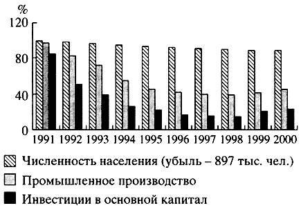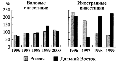 Потеря гарантированных рынков сбыта в европейской России и странах СНГ, резкое сокращение государственного военного заказа и утрата позиций в распределении инвестиционных ресурсов обусловили существенное ухудшение социально-экономической ситуации на Дальнем Востоке в 90-е годы. К 2000 г. практически все экономические параметры оказались значительно хуже, чем в начале реформы. Это касается основных макропоказателей (рис. 1), а также выпуска некоторых продуктов в натуральном выражении.
