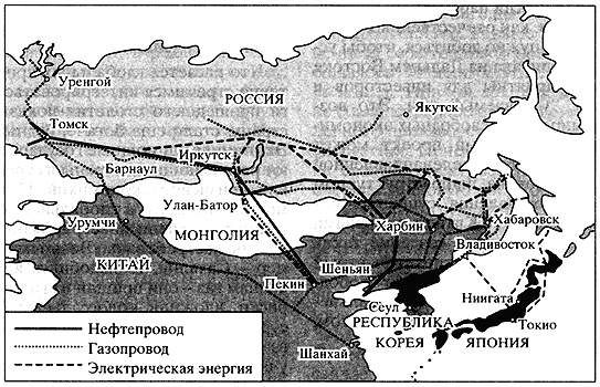Еще один стратегический элемент будущей международной инфраструктурной сети - система энергетических объектов на базе добываемых на Дальнем Востоке и в Сибири нефти и газа, а также выработки электроэнергии на территории Дальнего Востока (рис. 4). Формирование такой инфраструктурной международной сети в комплексе с развитием на Дальнем Востоке добывающих и перерабатывающих производств должно иметь положителный эффект на национальную экономику в целом. Возникновение стабильного и емкого рынка в Северо-Восточной Азии делает эффективной эксплуатацию ряда ресурсов восточных районов России.