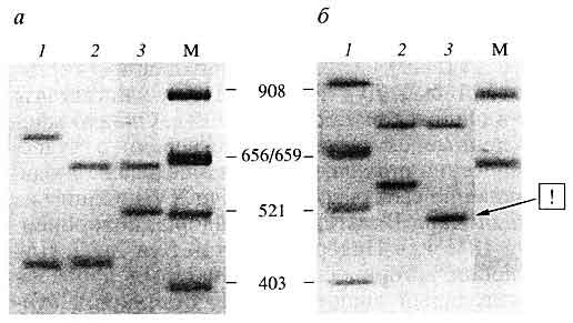 б - ложная семейная группа - мать, ребенок и лжеотец; стрелкой отмечен отцовский аллель ребенка, который отсутствует в ДНК неродственного мужчины;М - стандарт молекулярных масс Alul-гидролизат ДНК плазмиды pBR322, приведены размеры в парах нуклеотидов Индивидуализирующая система на основе анализа ПДАФ митохондриальной ДНК. Особая ценность данного методического подхода обусловлена тем обстоятельством, что в целом ряде случаев для экспертизы могут быть недоступны идентифицирующие объекты, которые позволили бы прямо установить индивидуализирующие признаки погибших на уровне их хромосомной ДНК. Остается возможность только непрямой идентификации, например, путем использования в качестве идентифицирующих объектов биологических образцов, полученных от родственников устанавливаемых лиц. Однако в этих условиях решение судебно-медицинской задачи идентификации с помощью стандартного молекулярно-генетического анализа хромосомных маркеров сталкивается с серьезными трудностями.