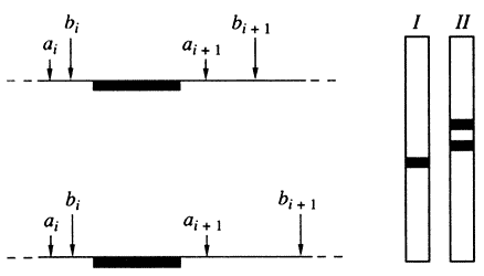 Слева - схема расположения на гомологичных хромосомах соседних участков узнавания (ai и ai+1; bi и bi+1) двух рестриктаз (I и II), зачерненный участок - область гомологии зонда; справа - схематическая картина результата блот-гибридизации с данным зондом суммарной ДНК, гидролизованной рестриктазами I и II Индивидуальный полиморфизм длины рестриктазных фрагментов создает предпосылки для решения задач, связанных с индивидуализацией организма и установлением его биологических родственных связей с другими индивидуумами. Однако большинство полиморфных геномных локусов - потенциальных генетических маркеров - имеет только два варианта: дикий тип/мутация, то есть являются диморфными или диаллельными. Ценность диморфных маркеров невелика, потому что у многих людей может оказаться один и тот же вариант такого гена. Поэтому, как уже указывалось, индивидуализирующее значение имеют не любые, а только гипервариабельные полиморфные фрагменты.Поскольку гипервариабельные локусы мультиаллельны, то информативность маркерных систем на их основе намного выше, чем информативность систем (как правило, диаллельных), базирующихся на единичных нуклеотидных заменах. Теоретически можно предполагать, что высокая локальная генетическая вариабельность вызвана не столько точковыми нуклеотидными мутациями или микроделециями/инсерциями, сколько другими механизмами, приводящими к более существенной реорганизации геномных последовательностей: транспозициями, неравными или незаконными рекомбинациями, проскальзыванием репликативного комплекса и т.п. Как оказалось, такие локусы достаточно распространены в геноме человека.