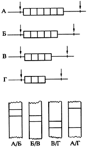 Рис. 3. Последовательности ДНК с варьирующимся числом тандемных повторовВверху - варианты таких локусов А, Б, В и Г различаются по длине на один повторяющийся сегмент, сайты рестрикции отмечены стрелками; внизу - схематическая картина блот-гибридизации с молекулярным зондом, гомологичным тандемному повтору, некоторых гетерозиготных по данному локусу ДНК