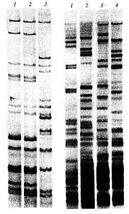 полученные с помощью меченного дигоксигенином молекулярного зонда (САС)5 И. Эпплена (слева) Рис. 5. Геномные "отпечатки" четырех неродственных
