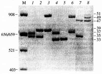 хромосомного локуса ApoB-3'VNTR (2р24-р23) восьми неродственных индивидуумовСправа указаны номера аллельных вариантов, присутствующих в данной выборке (номер аллеля отражает число тандемных повторов), слева - размеры в парах нуклеотидов, М - стандарт молекулярных масс Alul-гидролизат ДНК плазмиды pBR322. Каждый индивидуум обладает двумя полиморфными фрагментами (две полосы на электрофореграмме), характеризующимися определенным расположением на дорожке геля. В большинстве случаев этот набор из двух полос у неродственников не совпадаетЧаще всего полосы на электрофореграмме визуализируют с помощью красителя этидиумбромида в ультрафиолетовом излучении или путем окрашивания нитратом серебра. В последнее время, однако, все более активно внедряется регистрация амплифицированных фрагментов ДНК с использованием более чувствительных методов детекции, например, с помощью флуоресцентных меток, возбуждаемых лазерным излучением. Подобные методы требуют специального аппаратного обеспечения и относительно дороги, но они анализируют картину электрофоретического разделения с очень высокой точностью в режиме реального времени. Кроме того, открывается возможность разработки мультиплексных амп-лификационных систем, которые позволяют одновременно анализировать ПДАФ сразу нескольких локусов (их может быть больше десятка). Создаваемый уже суммой локусов амплификационный профиль ДНК оказывается чрезвычайно полиморфным, ведь он является комбинацией нескольких независимых полиморфных элементов, что и обусловливает его очень высокую индивидуальную специфичность (рис. 7).
