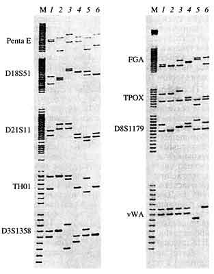 К концу 80-х годов в судебно-медицинской экспертной практике были апробированы несколько мультилокусных зондов, аналогичных мультилокусным зондам Джеффриса. К их числу относятся разработанная в Институте молекулярной биологии АН СССР и независимо в Бельгии система М13, родственная ей немецкая MZ 1.3, а также японская система Муо, открытая бразильскими учеными система F10, зонды на основе так называемых простых последовательностей, созданные в ФРГ И. Эппленом. На рисунке 5 приведены геномные "отпечатки" нескольких индивидуумов, полученные с использованием зонда М13 для анализа рестриктазного гидролизата суммарной геномной ДНК человека. Эта технология с 1988 г. применялась в Бюро Главной судебно-медицинской экспертизы Минздрава России, однако начиная с 1992 г. постепенно была вытеснена более прогрессивными методами, основанными на полимеразной цепной реакции. В мировой практике интерес к ПДРФ-системам также постепенно снизился, и в настоящее время они практически не применяются, уступив место амплификационным системам.