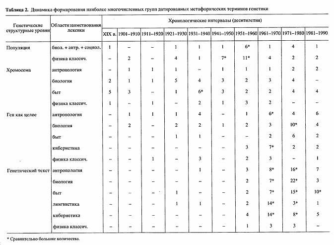 Видно, что "всплеск физикализма" в создании метафор - терминов генетики популяций - происходил в 40-е и особенно в 50-е годы, в период расцвета теоретической и прикладной физики. Метафоры, созданные позже, в основном были характеристиками структурно-функциональных участков геномов: в 60-70-е годы - в лингвистико-кибернетическом "стиле", а после 1970 г. - в "анимизирующем".
