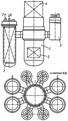 КД - компенсатор давленияНаиболее перспективной ныне считается интегральная компоновка оборудования реакторной части судовой ЯЭУ (рис. 5). Ее достоинства обусловлены тем, что весь объем теплоносителя первого контура реакторной установки локализуется в одном корпусе, все оборудование первого контура также размещается в этом корпусе, исключаются неотсекаемые участки первого контура на случай разгерметизации, резко уменьшается число корпусных конструкций, арматуры, снимается опасность достижения критического значения флюенса нейтронов на корпус реактора. Однако следует иметь в виду, что в интегральной компоновке применяется только отработанное высоконадежное насыщающее оборудование, поскольку по ремонтопригодности она заметно уступает и петлевой, и блочной компоновкам.