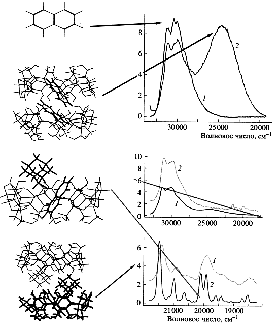 Наблюдающаяся трансформация спектра люминесценции представлена на рис. 1. При образовании комплекса циклодекстрин/нафталин образуется люминесцирующий центр, квантовый выход люминесценции которого выше, чем квантовый выход не погруженного в циклодекстрин нафталина. При образовании люминесцирующего центра состава "две молекулы циклодекстрина/две молекулы нафталина" спектр люминесценции содержит дополнительную длинноволновую полосу испускания (эксимерная флуоресценция, рис. 1, вверху).