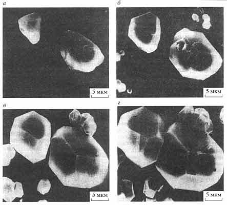 Стадии роста и самозарождения алмаза из газовой фазы (160 Торр; 1000°С), активируемой методом высокотемпературной химической транспортной реакции в системе графит-водород-алмаз: а - 0 мин, б -15 мин, в - 30 мин, г - 60 мин после начала наращивания затравочных кристаллов алмаза, помещенных на медную подложку (данные Л.Л.Буйлова с сотрудниками, полученные при наблюдении с помощью сканирующего электронного микроскопа)Принципиально новые наноматериалы, нанокомпозиты и наноизделия получают при совместном использовании модифицированных алмазных нанопорошков динамического (детонационного) синтеза и газофазных наноалмазных пленок. Комбинируя свойства подложек, наносимых на них наночастиц, а также наращиваемых затем из газовой фазы слоев алмаза, можно получать композиты с требуемыми характеристиками, в частности, эффективные "холодные" полевые эмиттеры электронов со значительным ресурсом работы в высоком и среднем вакууме.Актуальная задача - добиться сочетания в одной структуре (или в наноэлектронном приборе) алмаза и других широкозонных полупроводников, таких как нитриды галлия, индия, алюминия и бора. Важным результатом в этом направлении была впервые обнаруженная в нашей лаборатории гетероэпитаксия на алмазе пленок нитрида алюминия толщиной в десятки и сотни нанометров. За рубежом уже разрабатываются технологии изготовления подобных структур для применения в качестве светодиодов. На это особенно важно обратить внимание в связи с тем, что академик Ж.И. Алферов в своем докладе неоднократно подчеркивал растущее значение гетероструктур в микро- и наноэлектронике. Следует также отметить, что исключительно низкий коэффициент диффузии примесей обеспечивает алмазу особые перспективы именно в нанотехнологии. Это дает физическую основу для создания с его участием структур с весьма резкими в наномасштабе гетеропереходами, что позволит значительно повысить рабочие характеристики и надежность электронных приборов.