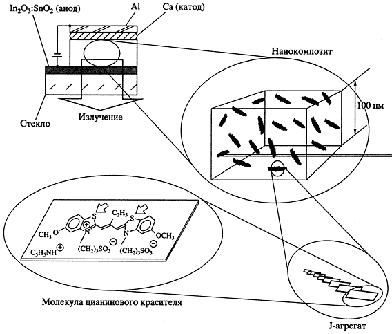 Особые свойства агрегатов цианиновых красителей были использованы для создания электролюминесцентных нанокомпозитных материалов (проект Института электрохимии РАН). J-агрегаты, диспергированные в полимерных матрицах, являются центрами рекомбинации зарядов и, соответственно, центрами излучения света в нужном спектральном диапазоне (рис. 2).