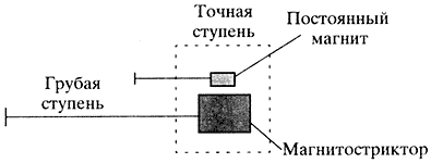 Такой позиционер состоит из грубой и точной ступеней позиционирования. Точная ступень жестко связана с грубой ступенью. В качестве последней используется любой движитель, обеспечивающий точность позиционирования более высокую, чем протяженность области точного позиционирования (например, линейный двигатель или микрометрический винт, обеспечивающие точность позиционирования грубой ступени 0.1-3 мкм). В качестве ступени точного позиционирования используется изотермическая камера, расположенная обычно на торце корпуса (толкателя) ступени грубого позиционирования. В этой камере удлинение стриктора происходит вследствие изменения напряженности магнитного поля в теле стриктора, обусловленного относительным поступательным или вращательным изменением положения магнитной системы. Простейшим способом создания изотермической магнитной системы является использование постоянных магнитов (источников магнитного поля, не связанных с генерацией тепла).
