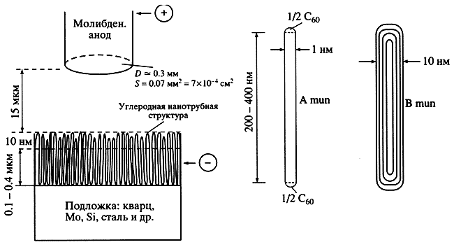 Как видно из типичных картинок, полученных на сканирующем туннельном микроскопе (рис. 1), углеродные нанотрубки (тубелены), как однослойные (А-типа), так и многослойные (В-типа), имеют разную длину (разница составляет ~10нм и более), и как правило, оказываются "обломанными" то есть не имеют "шапочек" C60. Таким образом, поверхность тубеленовой пленки представляет собой плоскость, усеянную остриями нанометрового диаметра, причем плотность упаковки острий может достигать 1012-1014 штук на 1 см2 При приложении электрического поля эти острия могут стать источниками автоэлектронной эмиссии. Это навело меня и моих коллег на мысль об использовании таких пленок в качестве эмиттеров электронов в вакуум. Идея была высказана и реализована нами в 1993 г. и первые результаты опубликованы в начале 1994 г. [5] и представлены на VII Международную конференцию по вакуумной микроэлектронике состоявшуюся в июле 1994 г. в Гренобле. Схема эксперимента приведена на рис. 1.