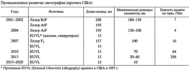 * Более точно длина волны зависит от материала мишени. В настоящее время большинство предлагает ксенон, максимум излучения которого лежит на 13.5 нм.Чтобы построить литографический процесс на более чем в 10 раз меньшей длине волны, требуется пересмотреть всю технологию. Для его реализации необходимо разработать новые источники излучения на длине волны 13 нм, в 10 раз улучшить гладкость поверхности, точность формы и термостабильность оптических элементов, точность механических устройств установок экспонирования, фактически создать мир атомарных точностей. В таблице дан прогноз развития литографии в США, и в последней графе приведен объем памяти на чипе, что как-то характеризует рост мощности вычислительной техники. Мы видим, что, начиная с 2004 г., планируется использование экстремальной ультрафиолетовой (EUV) литографии в промышленном производстве. Что касается лабораторного варианта EUV литографии, то в 1998 г. на фирме "Моторола" получены первые чипы с минимальным размером элементов 70 нм, затем - 30 нм. В 1999 г. в Ливерморской национальной лаборатории США построен первый литограф, прообраз промышленного. Таким образом, в лабораторных экспериментах уже в 1998 г. достигнуты минимальные размеры элементов, планируемые в промышленности к 2013 г.