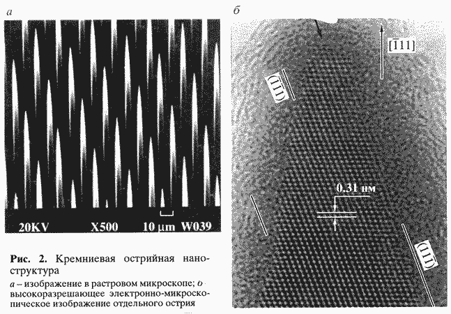На рис. 2, где приведено изображение острийной наноструктуры на основе кремния, а также отдельного острия [3], можно четко видеть, что вершина острия состоит всего лишь из нескольких атомов кремния. Эти наноструктуры можно использовать при разработке принципиально новых экранов для дисплеев и телевизоров, они уже выступают в качестве кантилеверов для зондовой микроскопии и различных эмиттеров.