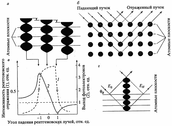 Рис. 3. Формирование стоячей рентгеновской волны в кристалле в условиях двухволновой дифракции и ее движение относительно атомных плоскостейИзменение угла падения рентгеновского пучка на кристалл сопровождается перемещением стоячей волны относительно неподвижных атомных плоскостей в направлении, перпендикулярном плоскостям. Это приводит к изменению интенсивности поля стоячей волны на атомных плоскостях, что, в свою очередь, ведет к модуляции интенсивности выхода любого вторичного излучения. Практически регистрация вторичных излучений в условиях дифракции (метод стоячих рентгеновских волн) позволяет определять пространственное (структурное) положение атомов определенного сорта в наноматериалах и наноструктурах различной природы.а, б - взаимные положения стоячей волны и атомных плоскостей, соответствующие разным углам падения рентгеновского излучения на кристалл внутри области отражения; в - зависимости выхода вторичного излучения и интенсивности отражения рентгеновского излучения от его угла падения на поверхность вблизи дифракционного угла Брэгга; г - стоячая волна в кристалле и над его поверхностью (E0 и ЕH - амплитуда падающей и отраженной волн соответственно)