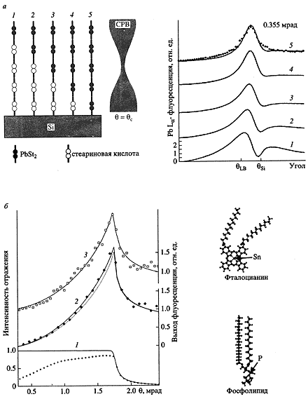 б - экспериментальные и расчетные угловые зависимости выхода флуоресценции от ленгмюровских пленок на поверхности жидкой субфазы: 1 - рентгеновское отражение; 2 - угловая зависимость интенсивности SnKa- флуоресценции от монослоя фталоцианина олова; 3 - угловая зависимость интенсивности РKa- флуоресценции от монослоя фосфолипида