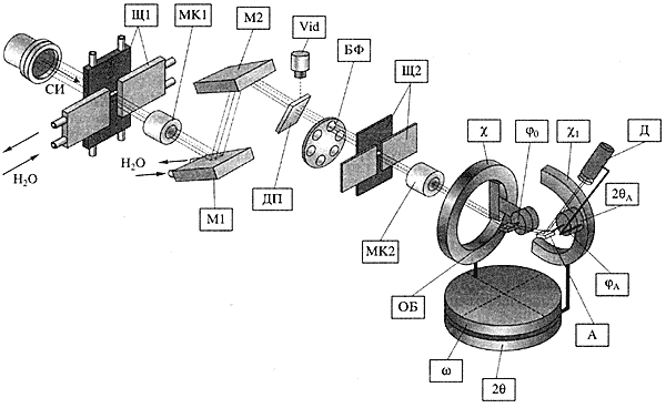 В Институте кристаллографии РАН совместно с РНЦ "Курчатовский институт" и рядом академических институтов в последние годы был разработан и создан комплекс экспериментального оборудования для проведения исследований на источнике синхротронного излучения. Станция прецизионной рентгеновской оптики (рис. 5) предназначена для проведения описанных выше экспериментов и представляет собой комплекс уникального оборудования, созданного российскими учеными и инженерами. Она соответствует мировому уровню и включает в себя двухкристальный монохроматор, многокружный гониометр, элементы вакуумного канала, блоки формирования пучка и юстировки объектов.