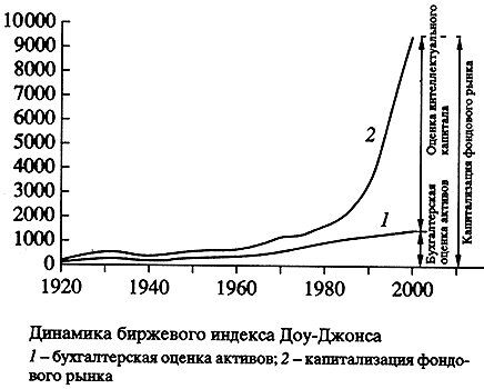 Последние десятилетия XX в., особенно 90-е годы, окончательно утвердили научно-технический прогресс в качестве важнейшего фактора экономического развития, основы конкурентоспособности фирм, отраслей, национальных экономик. В значительной степени НТП определяет различия между уровнем доходов богатых и бедных стран, является показателем жизнеспособности и эффективности общественных институтов и социально-политических систем. Более того, отчетливо сформировалось понимание, что будущее процветание и даже выживание в глобальной экономике определяется центральной ролью нововведений, повышающих производительность труда и/или вложенного капитала. В течение прошлого века структура экономики развитой части мира претерпевала непрерывные изменения в своем движении от преимущественно аграрной к индустриальной и далее к экономике услуг. В начале XXI в. мировая экономика активно пытается формировать новую парадигму научно-технического развития. Ее слагаемыми выступают: возрастающая взаимозависимость рынков капитала и новых технологий, усиление социальной ориентации новых технологий, глобальный характер создания и использования новых знаний, технологий, продуктов и услуг. На рубеже 90-х годов родилось то, что сегодня называется "экономика знаний", или новой экономикой. Ее отличительной чертой является ускоренное развитие нематериальной сферы и нематериальной среды хозяйственной деятельности. Производство, распределение и использование знаний составляют основу новой экономики, а ее инфраструктурой становится всемирная информационная "паутина" (табл. 1). В этом заключается смена парадигмы экономического развития, которая существенно уменьшает материально-ресурсные и пространственные пределы границ темпов роста. В течение большей части XX в. рыночная стоимость компаний была преимущественно функцией физических активов, фиксируемых бухгалтерской отчетностью. В начале 80-х годов индекс Доу-Джонса (DJIA) стал показывать возрастающий отрыв рыночной капитализации от стоимости реальных активов - зданий, сооружений, оборудования и запасов (см. рис.). Экономисты первыми обратили внимание на этот факт, и в обиход вошел коэффициент Тобина - соотношение рыночной цены компании к цене замещения ее реальных активов. Разрыв между этими показателями имеет разные названия: невидимые активы, интеллектуальный капитал, организационные возможности. Сегодня мало кто сомневается в том, что именно интеллектуальный капитал создает основную стоимость для акционеров фирмы, а компетентность ее менеджмента определяется качеством управления этими невидимыми активами. Что же входит в число невидимых активов? Как правило, это вложения в человеческий капитал фирмы и в НИОКР, торговая марка, интеллектуальная собственность, квалификация менеджеров и персонала, отношения с потребителями и поставщиками, внутрифирменная культура, включая этику и социальную ответственность, и т.п. Эти многообразные составляющие возможностей организации получают признание и оценку на рынке (ее адекватность и устойчивость - отдельная проблема). Если попытаться свести их к одному знаменателю, то это все различные формы знания (явного и неявного). Таким образом, в практике и теории менеджмента возникла совершенно новая область - управление интеллектуальными активами, ил