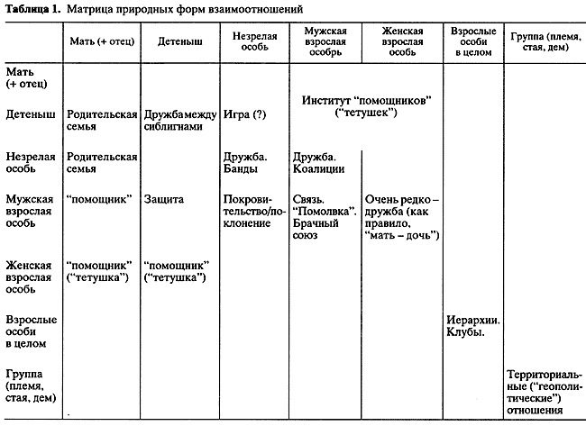 Нет никаких сомнений в том, что многие элементарные формы социальной жизни имеют глубокие биологические корни. Аналоги родительской семьи, супружества, дружбы, взаимовыгодных коалиций, иерархических структур в животном мире настолько напоминают соответствующие социальные конфигурации человеческого сообщества, что здесь допустимо вести речь об эволюционных праформах социальной жизни человека.
