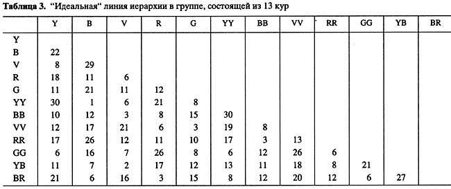 Пример подобной иерархии приведен в табл. 3, где в вертикальных столбцах показано число кле-ваний, которые данная курица нанесла членам своей группы, а в горизонтальных строках - число клеваний, которые она получила от других кур. Строгая конфигурация данной матрицы отражает идеальный иерархический порядок в куриной группе: ни одна курица не клюнула птицу, которая имеет более высокий статус. Так, птица-лидер по имени Y не получила ни одного клевания от других кур, в то время как птица BR, замыкающая иерархию, не посмела клюнуть ни одну из своих "товарок".