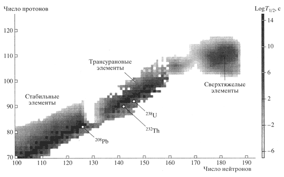 В заключение вновь вернусь к тому, с чего я начал свое сообщение. Стабильные элементы заканчиваются свинцом и висмутом. Ядра этих атомов являются магическим, что определяется повышенной энергией связи нуклонов в ядре. Затем следует область радиоактивных элементов, среди которых торий и уран наиболее устойчивы. Их период полураспада сравним с возрастом нашей планеты. По мере продвижения в сторону более тяжелых элементов время жизни ядер резко уменьшается. "Полуостров" радиоактивных элементов имеет выраженные границы. Теория предсказывала, что за "полуостровом" будут следовать "острова стабильности". Они будут расположены в области очень тяжелых элементов, ядра которых обогащены нейтронами. Мы только приблизились к границам этого гипотетического "острова стабильности". Опыты продолжаются.