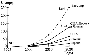 Показательна с этой точки зрения американская программа "Сверхпроводимость для электроэнергетики 1996-2000 гг." [7]. Ее официальная цель сформулирована вполне амбициозно: к 2010 г., периоду наиболее активной замены электроэнергетического оборудования, отработавшего свой ресурс во многих энергосистемах мира, электромашиностроительные фирмы США должны завоевать большую часть мирового рынка, предъявив ему дешевое и компактное сверхпроводниковое оборудование, превышающее по эффективности и надежности оборудование традиционного (резистивного) исполнения. Включение сверхпроводниковых компонентов в коммерческое электротехническое оборудование призвано обеспечить глобальное стратегическое преимущество промышленности США в XXI в. При этом следует иметь в виду, что по оценкам Всемирного банка объем продаж сверхпроводникового оборудования возрастет в мире с 2 в 2000 г. до 244 млрд. долл. в 2020 г. (рис. 5). Иными словами, за 20-летний период ожидается почти 100-кратный рост объема продаж.