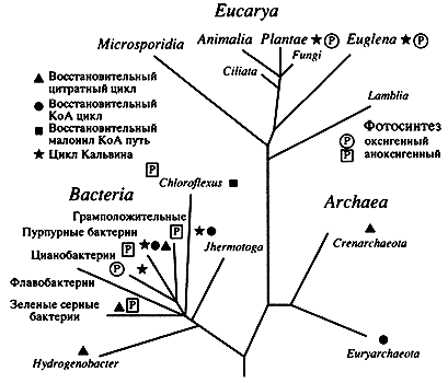 Рис. 3. Глобальное филогенетическое дерево микроорганизмов и распределение метаболических путей автотрофной фиксации углекислоты (по О. Кандлеру). Порядок ветвления и длина ветвей основаны на сравнении последовательностей нуклеотидов в 16/18S рДНК генов