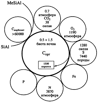 Функциональные связи в геосферно-биосферной системе легче всего продемонстрировать на основе взаимосвязи биогеохимических циклов (рис. 4). Ведущим является цикл органического углерода. На первом этапе при фотоавтотрофной ассимиляции углекислоты (СО2 + Н2О = [СН2О] + O2) происходило сопряжение цикла углекислоты, кислорода, органического углерода в молярном соотношении 1 : 1 : 1. Судя по изотопным отношениям, органический углерод формировался таким же путем в древнейших осадочных отложениях Земли. На втором этапе в результате дыхания органотрофов протекала обратная реакция и кислород удалялся ([СН2О] + O2 = СО2 + Н2О). Если бы не было деструкции, то система остановилась бы из-за избытка кислорода, что и наблюдается при культивировании цианобактерии в замкнутых сосудах, когда концентрация кислорода превышает 20%. Циклический характер биосферных процессов - это универсальная необходимость для геосферно-биосферной системы. В противном случае накопление продукта за геологическое время вызовет остановку биогенного цикла.