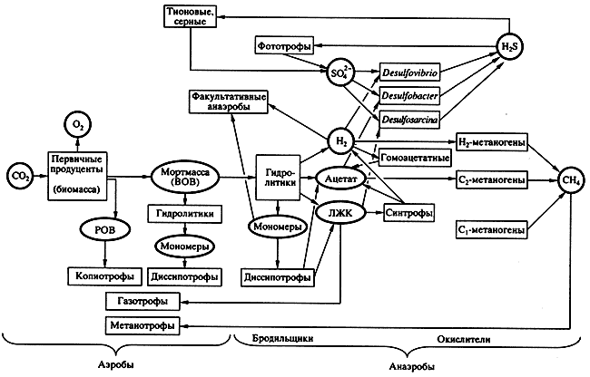 Часть взвешенного органического вещества переходит в анаэробную зону, где действует группировка анаэробных гидролитиков. При этом олигомерные продукты гидролиза частично рассеиваются, их потребляют диссипотрофы, способные к утилизации растворимого органического вещества в низкой концентрации. Анаэробы-бродильщики образуют водород, ацетат и "летучие жирные кислоты", которые перерабатываются специализированными группами организмов. В среде, где отсутствуют внешние окислители, водород и ацетат используются метанообразующими археями. Летучие жирные кислоты разлагаются на ацетат и водород синтрофами. Метан поднимается на поверхность, и его окисление метанотрофами препятствует доступу кислорода в анаэробную зону. В присутствии соединений серы на завершающих этапах метаболизма главенствуют сульфатвосстанавливающие бактерии и бактерии, окисляющие сероводород. В целом метаболизм сообщества аналогичен метаболизму клетки, однако вместо ферментов действуют бактерии со специфическими функциями.