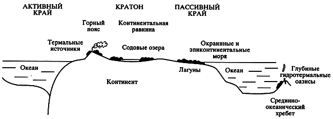 для которых характерны специфические микробные сообществаВ качестве модели рассмотрим условный континент, окруженный океаном (рис. 6). На активном краю континента действует вулканизм, на пассивном краю в окраинных морях и лагунах происходит осадконакопление, во внутриконтинентальной области имеет место субаэральное выветривание. В океане интерес представляют зоны активной гидротермальной деятельности, в которых можно исследовать глубинную подземную биосферу гипертермофилов. В каждом из этих районов развиваются характерные микробные сообщества. Мы изучили: