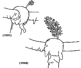На рисунке, который сделан нами по фотографии 1991 г., видно, что колония еще только начинает ветвиться, ее высота меньше 10 см. На фото 1998 г. мы видим уже вполне сформировавшуюся колонию характерной формы, с многими веточками, хотя еще и не столь вытянувшуюся в длину, как крупные колонии того же вида, запечатленные в 1991 г. на мелких обломках “Титаника”. За семь лет она выросла более чем вдвое, достигнув длины около 20 см. Таким образом, ее среднегодовой прирост превышает 1 см. Подобная скорость роста (1—2 см/год) известна и у мелководных рифообразующих кораллов, правда, иногда они могут прирастать и на 5—10 см/год.