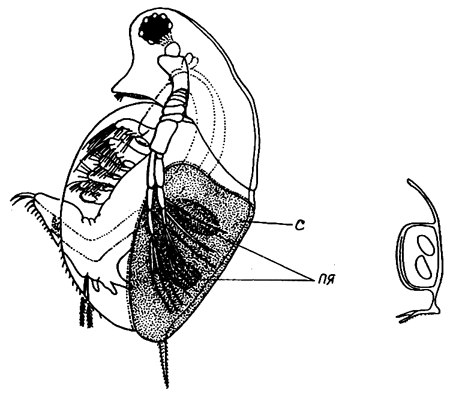 Оплодотворенная самка дафнии с “седлышком” (с) и двумя покоящимися яйцами (пя) на спине, справа - сброшенное “седлышко”.