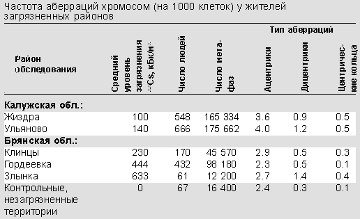 Выборочное обследование населения загрязненных территорий, проведенное в отдаленные после аварии сроки (1989-1998), показало, что средняя частота хромосомных аберраций в той или иной степени превышала контрольный уровень (см. табл.).