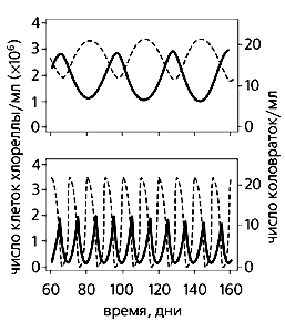 Ход численности хлореллы (штриховая линия) и коловратки, предсказанный разными вариантами модели. Если популяция водоросли состоит из многих клонов (вверху), колебания в системе хищник-жертва противофазны. Но когда популяция хлореллы представляет собой один клон, циклические колебания соответствуют классической модели.В экспериментах хищником было микроскопическое многоклеточное животное - коловратка (Brachionus calyciflorus), а жертвой - одноклеточная зеленая водоросль хлорелла (Chlorella vulgaris). Обычные колебания в таких системах возникают тогда, когда вслед за увеличением численности жертвы нарастает и численность хищника, затем, по мере усиления хищничества, популяция жертв начинает сокращаться, а когда их становится слишком мало и хищнику трудно прокормиться, его численность падает, после чего популяция жертв начинает восстанавливаться и весь цикл повторяется заново. Существенно, что максимум хищников всегда следует за максимумом жертв с небольшим запаздыванием во времени. Однако в системе коловратка-хлорелла, исследованной Йошидой и его коллегами, возникали странные колебания, когда максимум хищника (коловраток) приходился на минимум жертв (водорослей) в популяции, и наоборот. Очевидно, что такая динамика не может быть результатом взаимодействий, протекающих строго по типу хищник-жертва, какие-то другие факторы оказываются не менее важными.