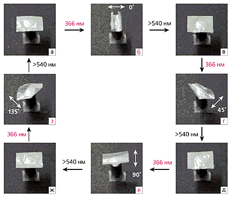 Пленка, находящаяся в исходном состоянии (а), после экспонирования светом с l=366 нм скручивается параллельно направлению поляризации - 0°, 45°, 90°, 135° (б, г, е, з) - и под действием света с l=540 нм возвращается в исходное состояние (в, д, ж).На основе такого фотомеханического эффекта можно создать новые быстродействующие актюаторы (роботы, оптические пинцеты) для микро- и наномасштабных операций, управляемые дистанционно с помощью луча лазера и не нуждающиеся в батарейках, моторах, шестеренках и т.п.