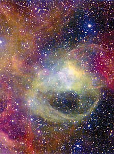 С четвертой туманностью N44C ситуация оказалась неясной. Облако He II окутывает две яркие О-звезды, температура которых, хотя и превышает существенно солнечную, все-таки недостаточно высока, чтобы объяснить ионизацию гелия. Да и быстрых движений, столь характерных для туманностей, подвергшихся воздействию звездного ветра, в N44C не обнаружено. Некоторые астрономы предполагают, что возбуждение N44C вызвано источником жесткого излучения, ныне угасшим (возможно, не навсегда). Таким источником может, например, быть аккреционный диск вблизи массивного компактного компаньона одной из О-звезд. Если компоненты этой гипотетической двойной системы обращаются по сильно вытянутой орбите, темп аккреции вещества на компактный объект, а значит, и рентгеновская светимость станут сильно варьироваться со временем. При этом сильное возбуждение туманности будет наблюдаться в течение короткого периода и после “выключения” рентгеновского источника, постепенно ослабевая. Правда, пока в излучении Не II из туманности N44C никаких изменений не наблюдается. Вероятно, приведенное выше объяснение не совсем адекватно. “Нельзя объяснить сразу все, - говорит один из авторов работы Й.Назе (Y.Naze; Льежский университет, Бельгия). - Мы полностью разобрались с природой трех туманностей, но N44C придется изучить более тщательно”.