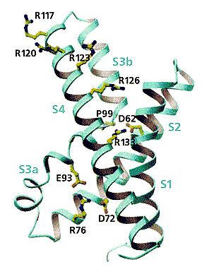 Катионные каналы (калиевые, натриевые и кальциевые), зависящие от потенциала на мембране и образующие большое семейство, построены по одному принципу. Самым подробным образом он представлен Мак-Кинноном на примере канального белка KvAP, выделенного из архебактерии Aeropyrum pernix. Его четыре одинаковые молекулы (субъединицы) окружают центральную проводящую ионы пору, стенки которой “облицованы” двумя гидрофобными спиральными сегментами - S5 и S6 - каждой субъединицы. Таких сегментов-спиралей, гибко соединенных между собой петлями, шесть. Вместе они составляют два разных функциональных участка - селективный фильтр (S5 и S6), определяющий ионную избирательность, и сенсор (S1-S4), реагирующий на изменение потенциала (рис.1). В этом структурном элементе особенно важны первые четыре остатка аргинина, несущие положительные заряды. За счет гибкости сочленения спиралей вся конструкция способна менять конформацию, чем обеспечивается закрытое или открытое состояние ворот и быстрый, избирательный перенос катионов.