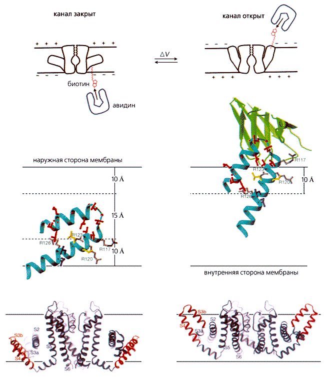 Рис. 3. Модели, иллюстрирующие перенос положительных зарядов канальным калиевым белком в ответ на изменение потенциала на мембране. По традиционной версии, четвертая спираль каждой субъединицы несет заряды и движется внутри основного белкового тела по канальцу, а форма тетрамера остается неизменной. По мнению Мак-Киннона, заряды переносятся “лопастями”, которые движутся по наружной поверхности тетрамера, изменяя его форму.Установленное по третичной структуре расположение “лопастей” противоречило их локализации, основанной на электрофизиологических экспериментах. Кроме того, в традиционных моделях постулировалось, что четвертая спираль любой субъединицы движется внутри собственной небольшой белковой полости, образованной другими частями молекулы, например спиралями 1-3 (рис.3). Мак-Киннон, исходя из своей структурной модели, предположил, что все происходит по-другому. “Лопасти”, находящиеся на внутренней стороне мембраны, перемещаются перпендикулярно к внешней без какой-либо выстланной белком полости и переносят таким образом заряды через электрическое поле (рис.3). Положение и передвижение “лопастей” было экспериментально подтверждено их связыванием с антителами, а также с помощью авидина, соединенного с биотином. Авидин, как гирька, подвешивается через ниточку биотина к “лопасти” и оттягивает ее (рис.4). Удалось даже измерить путь, который преодолевает каждая из них во время открывания ворот: он составляет примерно 20 A (рис.4). Когда мембрана деполяризована (т.е. положительно заряжен ее внутренний слой), “лопасти” поворачиваются вверх, к внеклеточной жидкости, и канал открывается. Если же этот слой приобретает отрицательный заряд, “лопасти” отгибаются в сторону, сжимая вход в пору, и канал оказывается закрытым. Таким образом, сенсор с его “лопастями” работает по весьма необычному принципу, основанному на присоединении гидрофобных катионов к рычагам, которые дают возможность мембранному электрическому полю выполнять механическую работу - открывать и закрывать проводящую ионы пору.